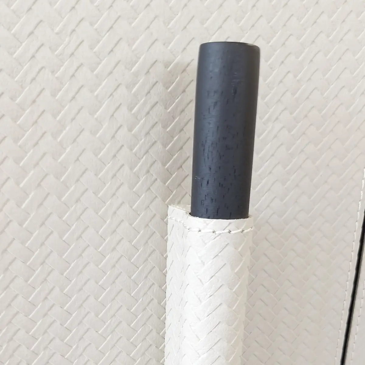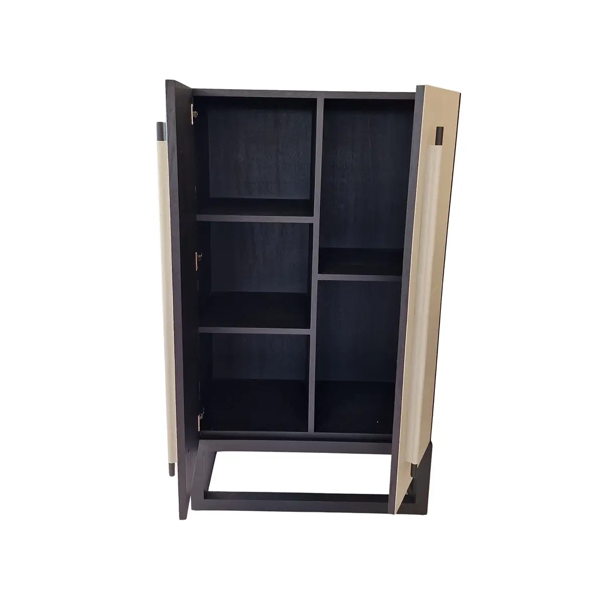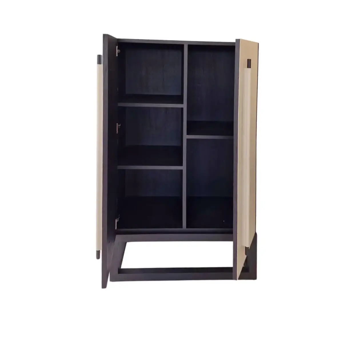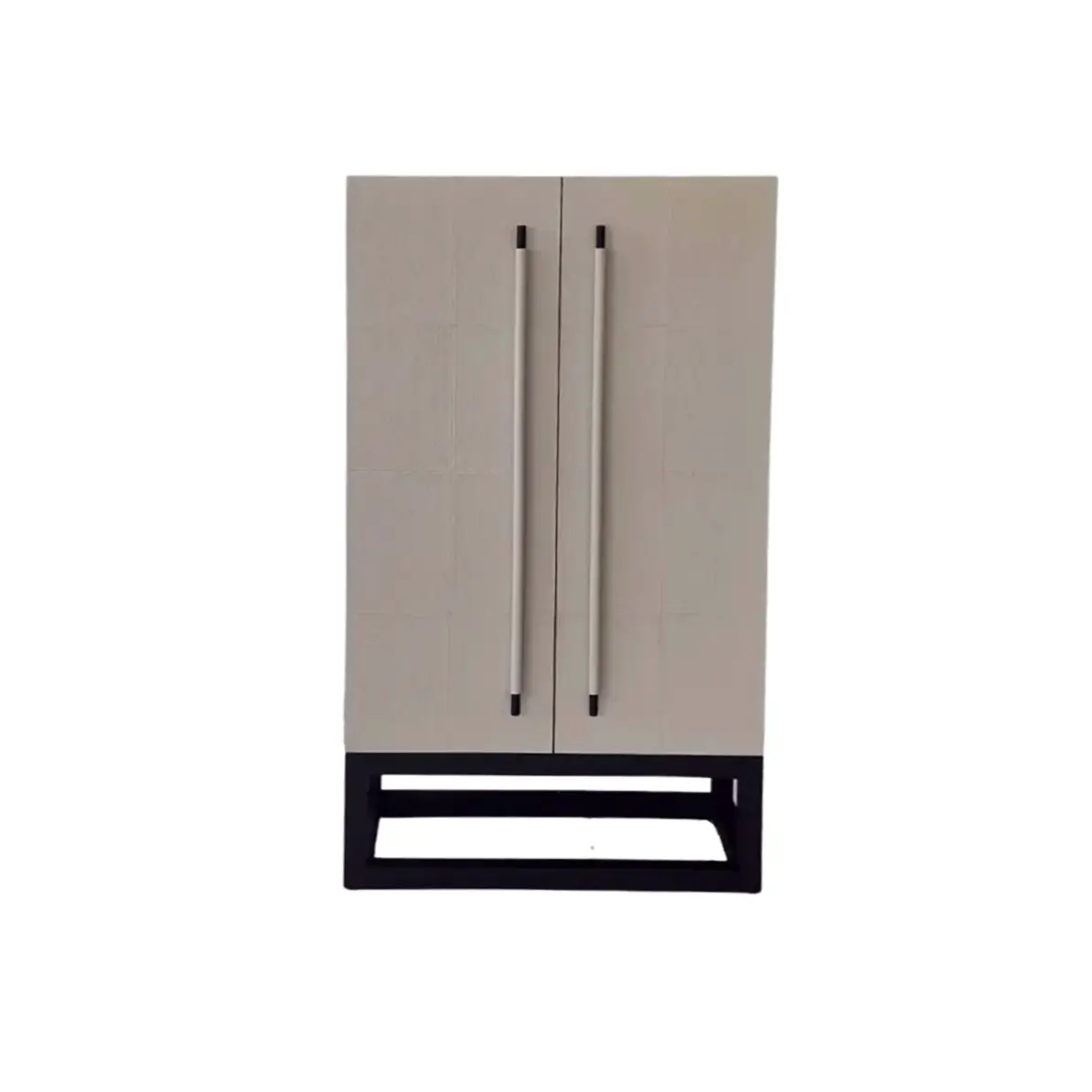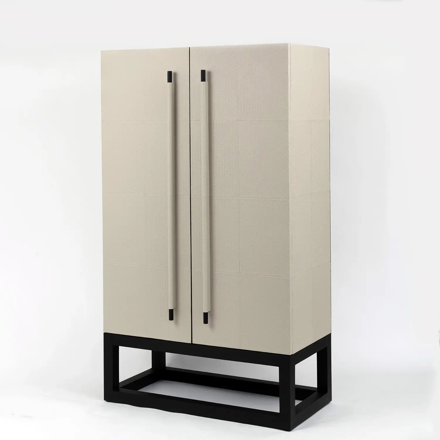 The base of the Arlington Armoire Woven Pumice Leather is a beautifully styled. The chic ‘confident’ base is finished in our matte carbon. This provides a striking contrast against the stunning lizard leather cabinet. The long leather wrapped wooden door handles have stitched detail.
