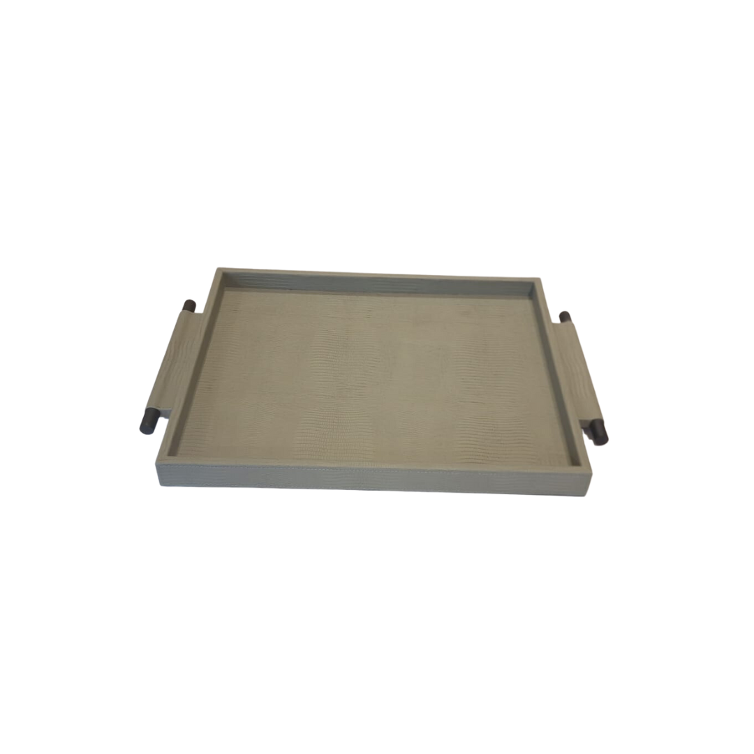 The Arlington Tray Lizard Leather is covered in luxurious leather and features elegant leather wrapped handles. All our trays use real leather with the base lined in a black piquet. These materials offer a sense of opulence with their intricate textures and unquestionable quality.