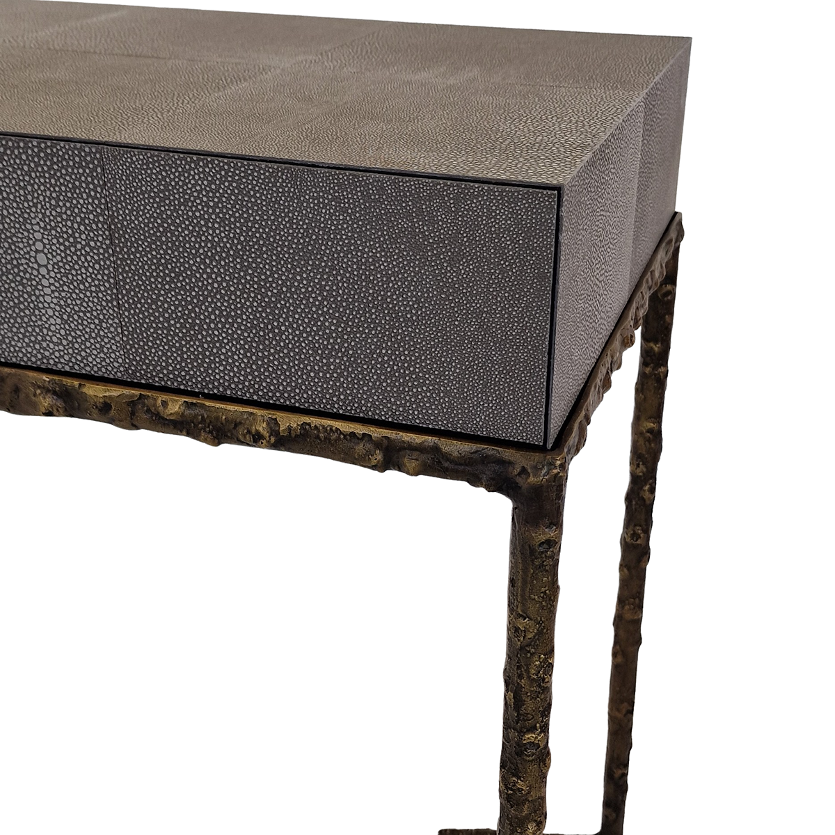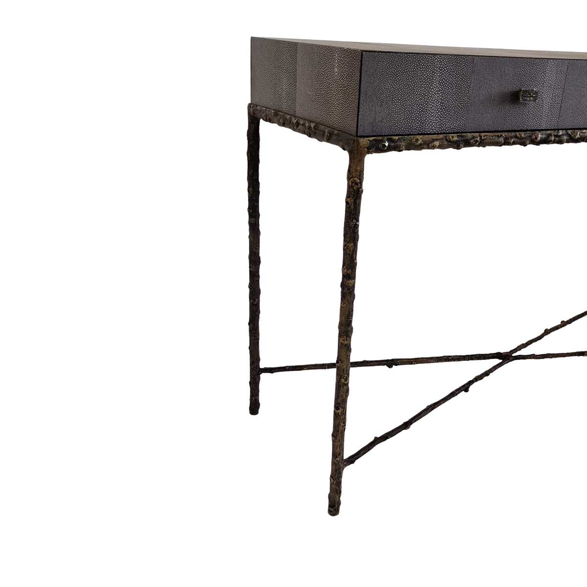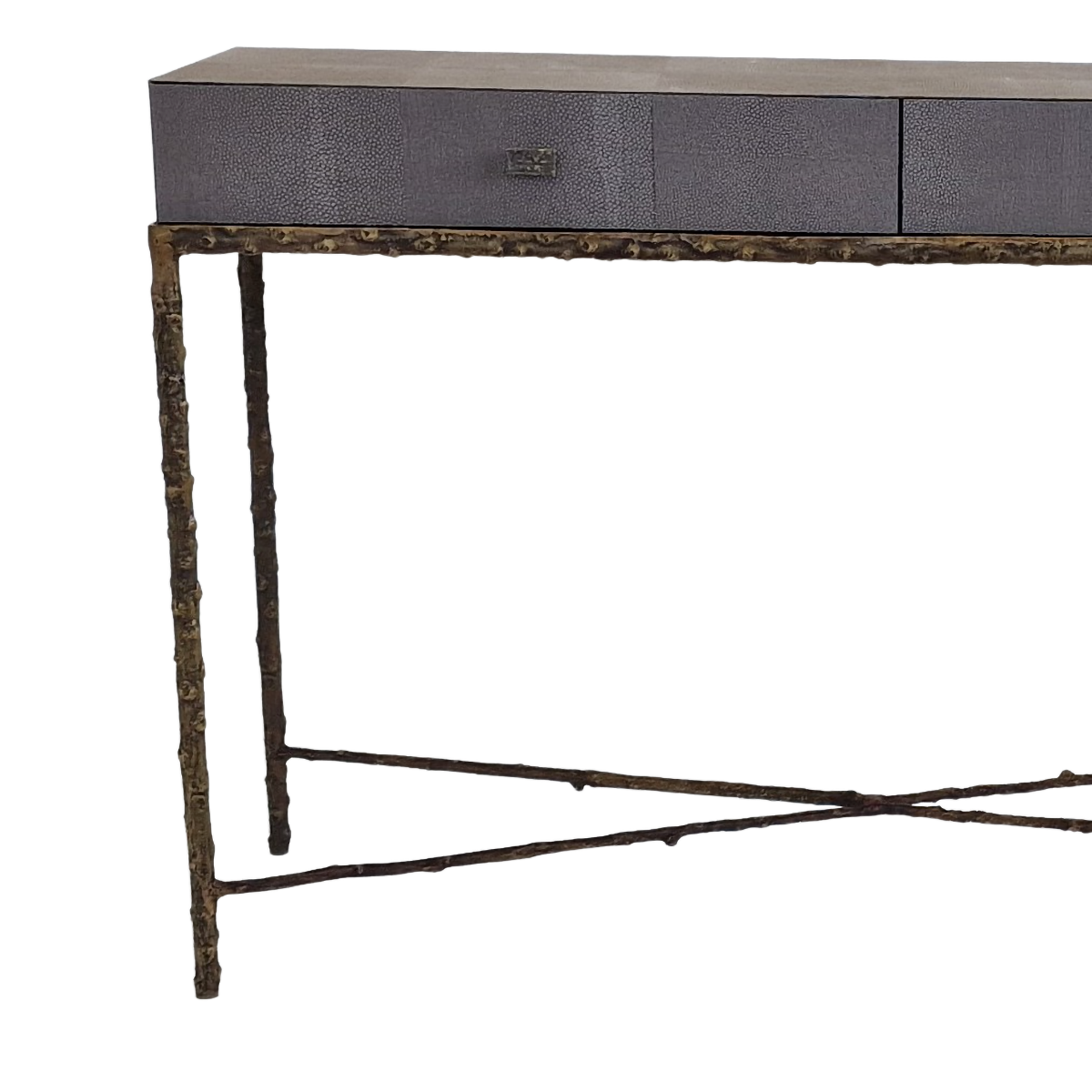 The Arun Console 2 Drawers Grey Shagreen Leather is part of our ‘signature’ look of exclusive bronze designs. Many of these provide masculine glamour. Others are softer and more graceful with an organic simplicity revealed only in silhouette.