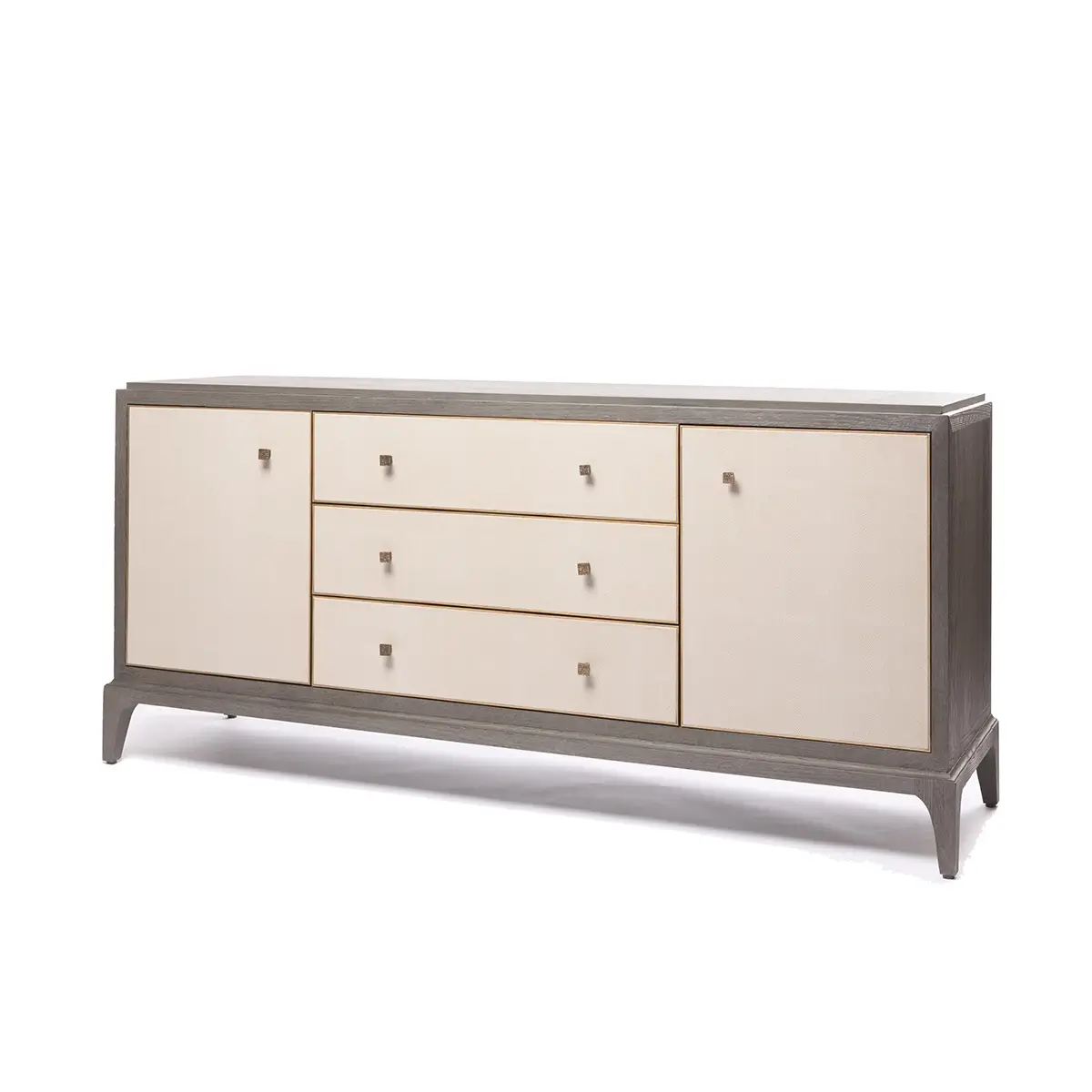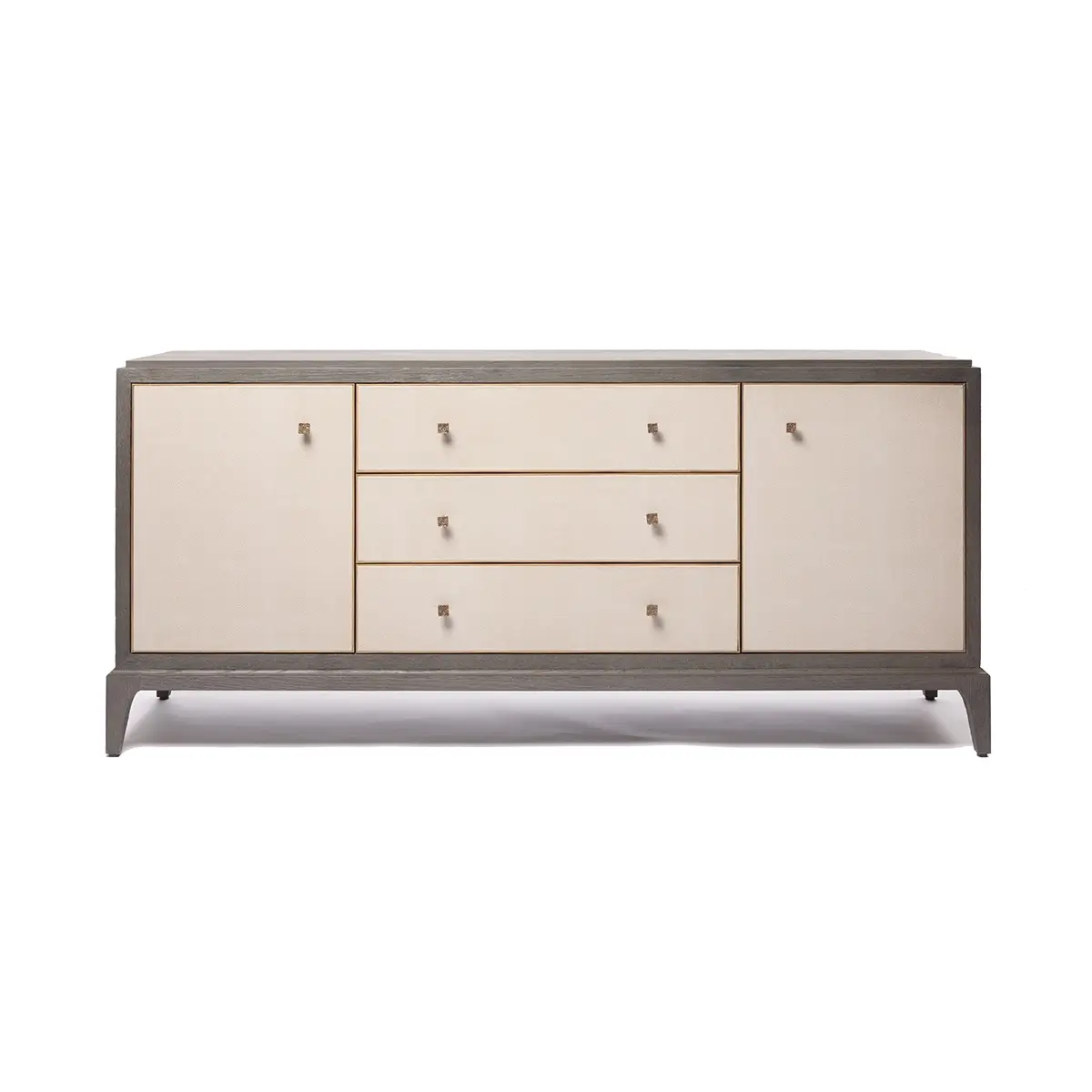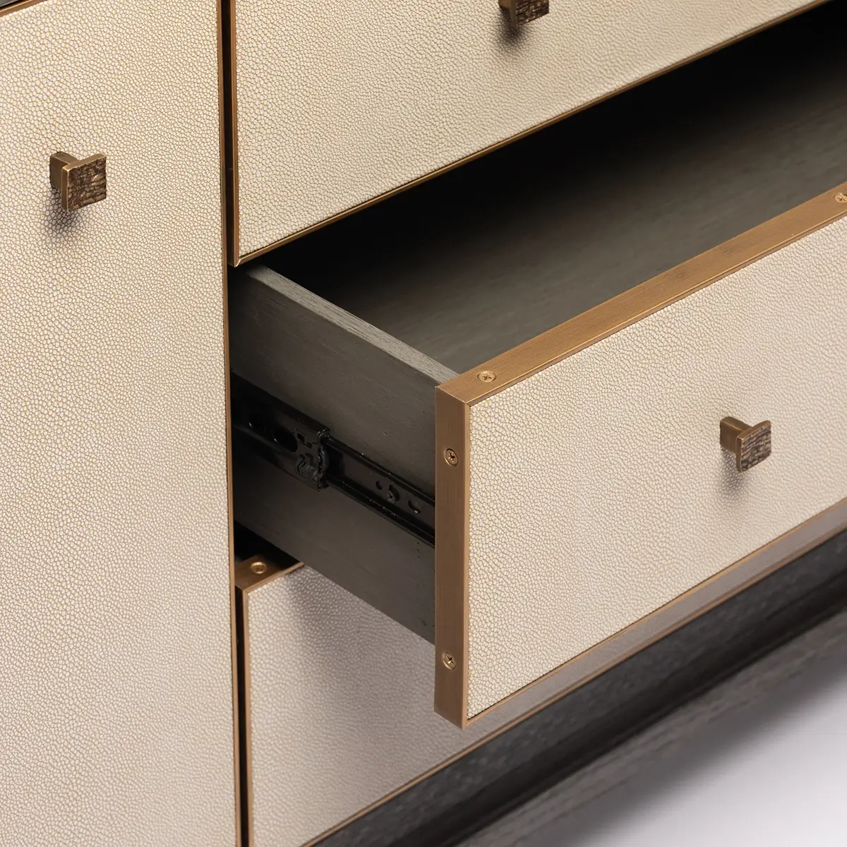 Other notable design accents of the Astor Cabinet Shagreen include the solid brass trim on the internal edge of the drawer fronts and the graceful curves of the wooden base. The surprise details, such as the brass trim, elevate this cabinet from the ordinary.