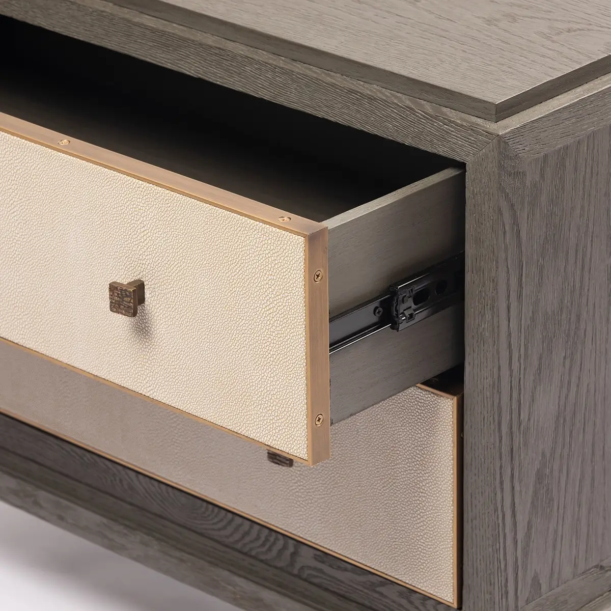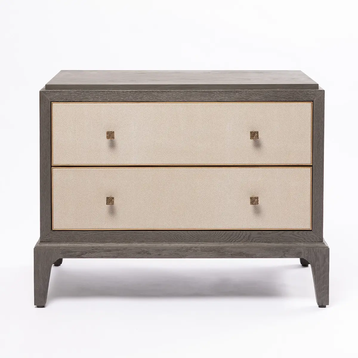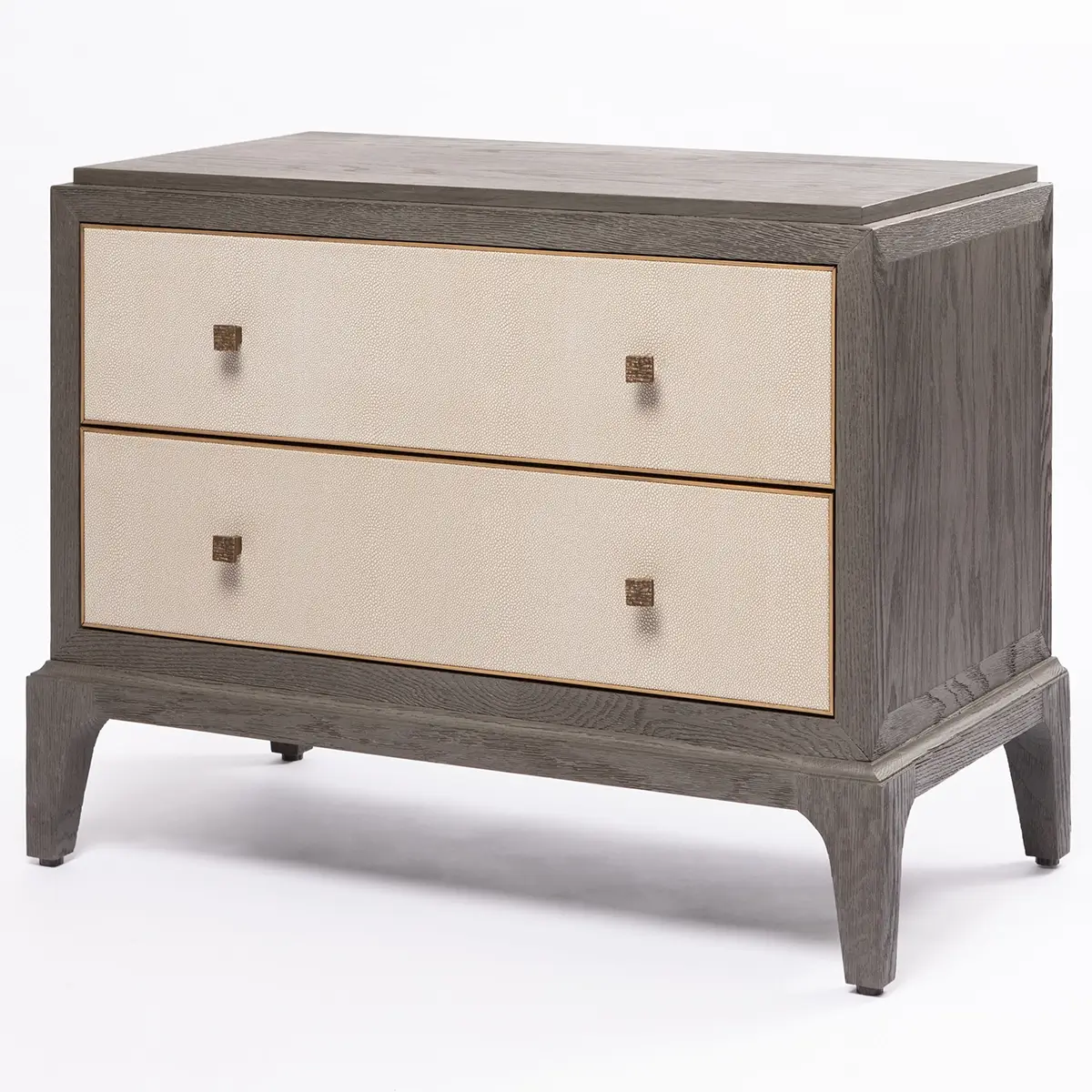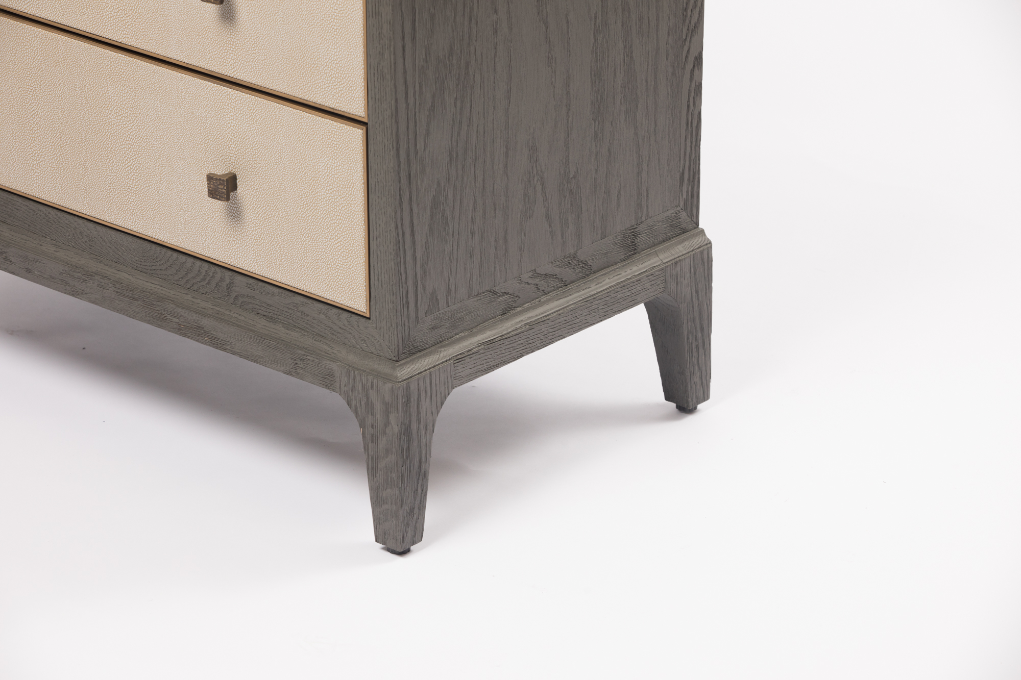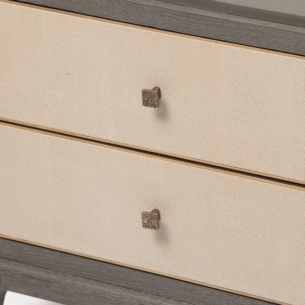 Other accents seen on the Astor nightstand shagreen are the solid brass trim to the internal edge of the drawer fronts. Only seen when opened these surprise details elevate this design from the ordinary. Also of note are the graceful curves to the wooden base. The Astor nightstand, with its two spacious drawers and features a well proportioned top, has been designed to seamlessly suit both contemporary, traditional, and classic interiors.