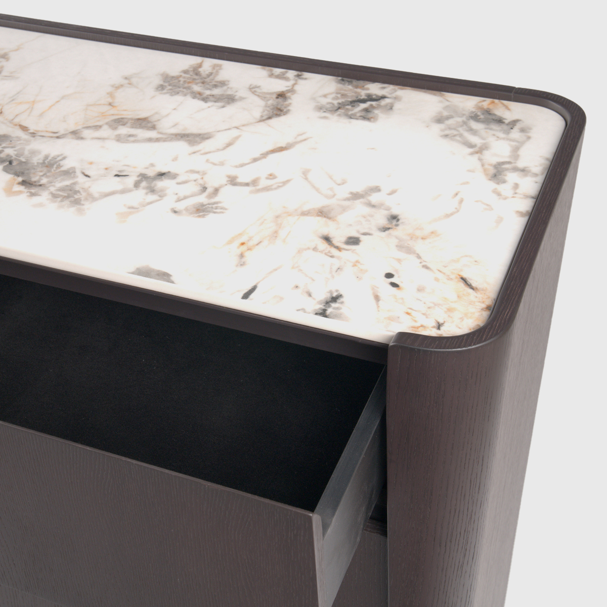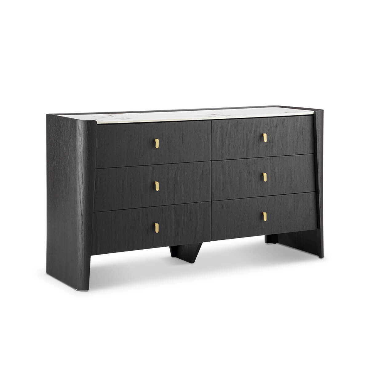 The unique, distinctively curved design of the chest sets it apart from more traditional pieces, adding a dynamic sense of movement and artistry to its structure. Topped with a luxurious cream ceramic marble, the chest not only offers a robust and beautiful surface but also acts as a perfect stage for displaying fine decor and personal items, enhancing the visual interest of your space.