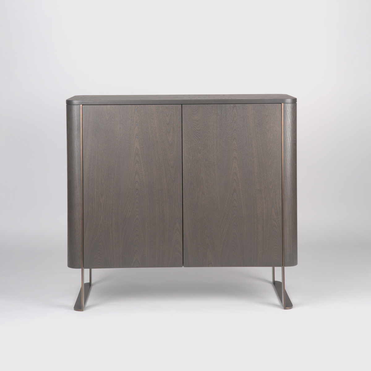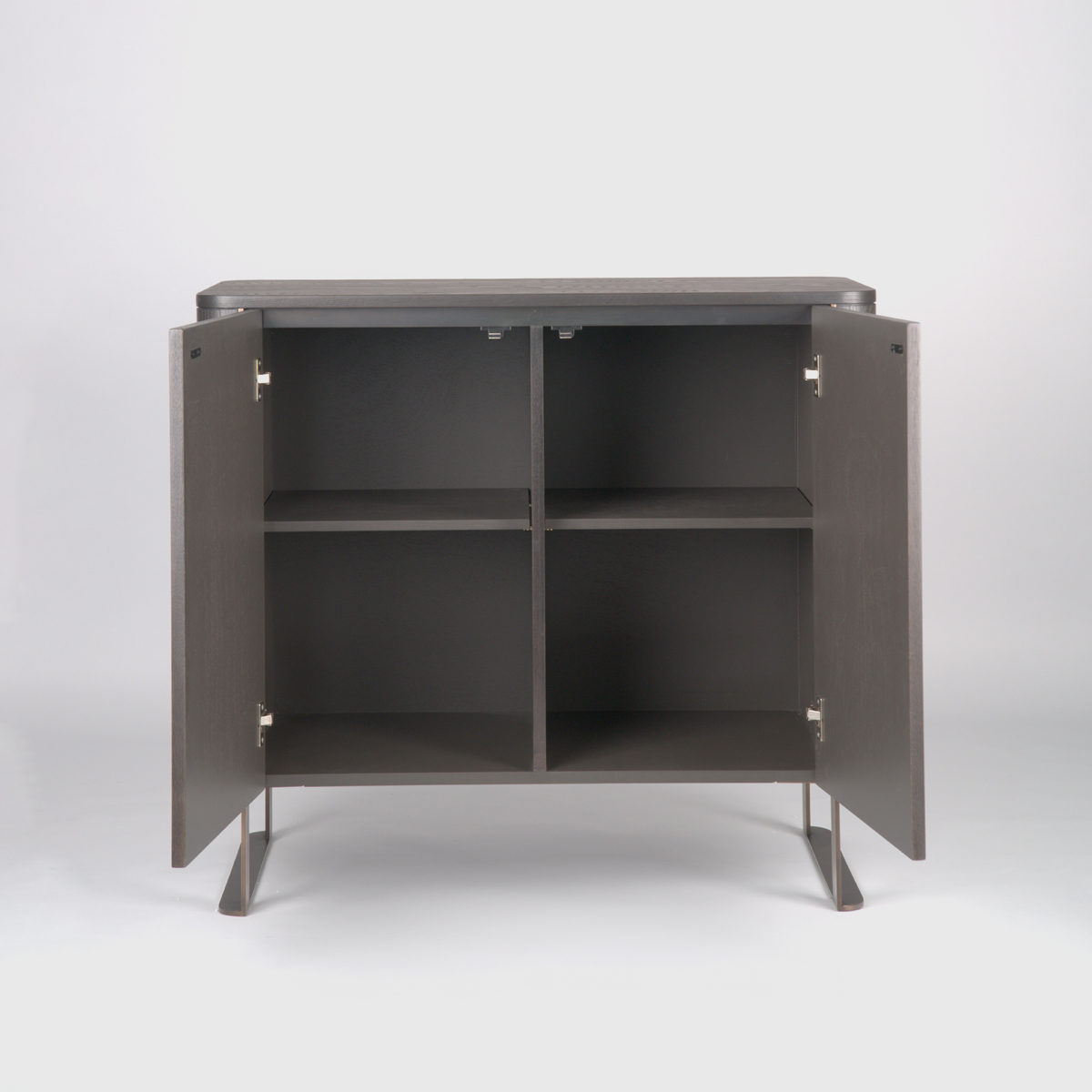 Crafted from exquisite Chocolate Oak, the cabinet exudes a warm, inviting hue that complements any interior décor. The oak’s subtle texture adds depth and character to the cabinet, while stainless steel accents finished in a bespoke bronze color highlight its edges, providing a metallic contrast that enhances its visual appeal.