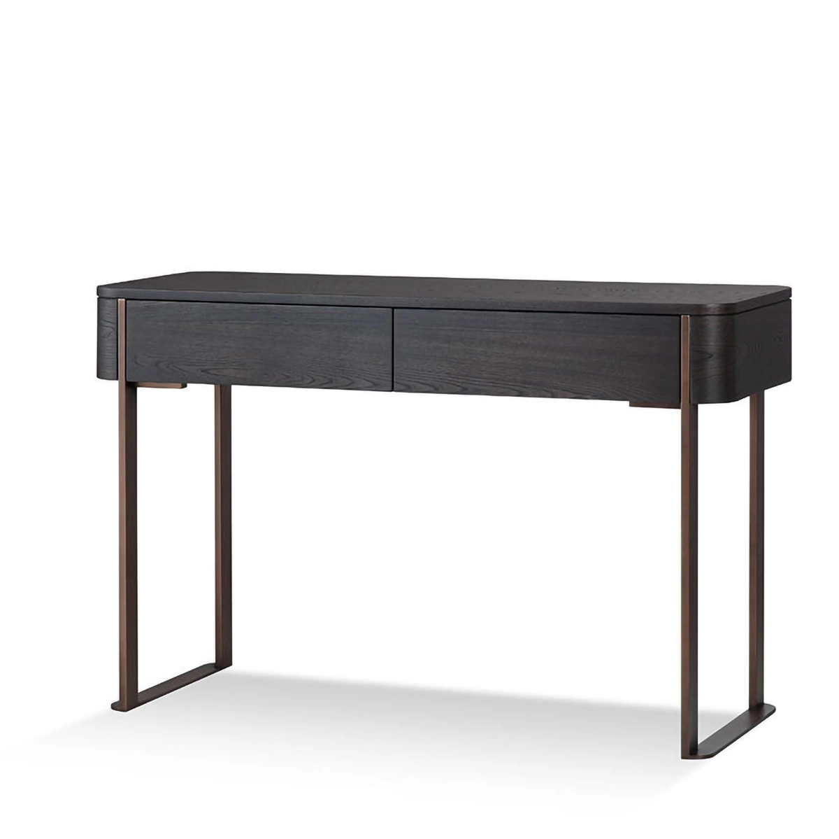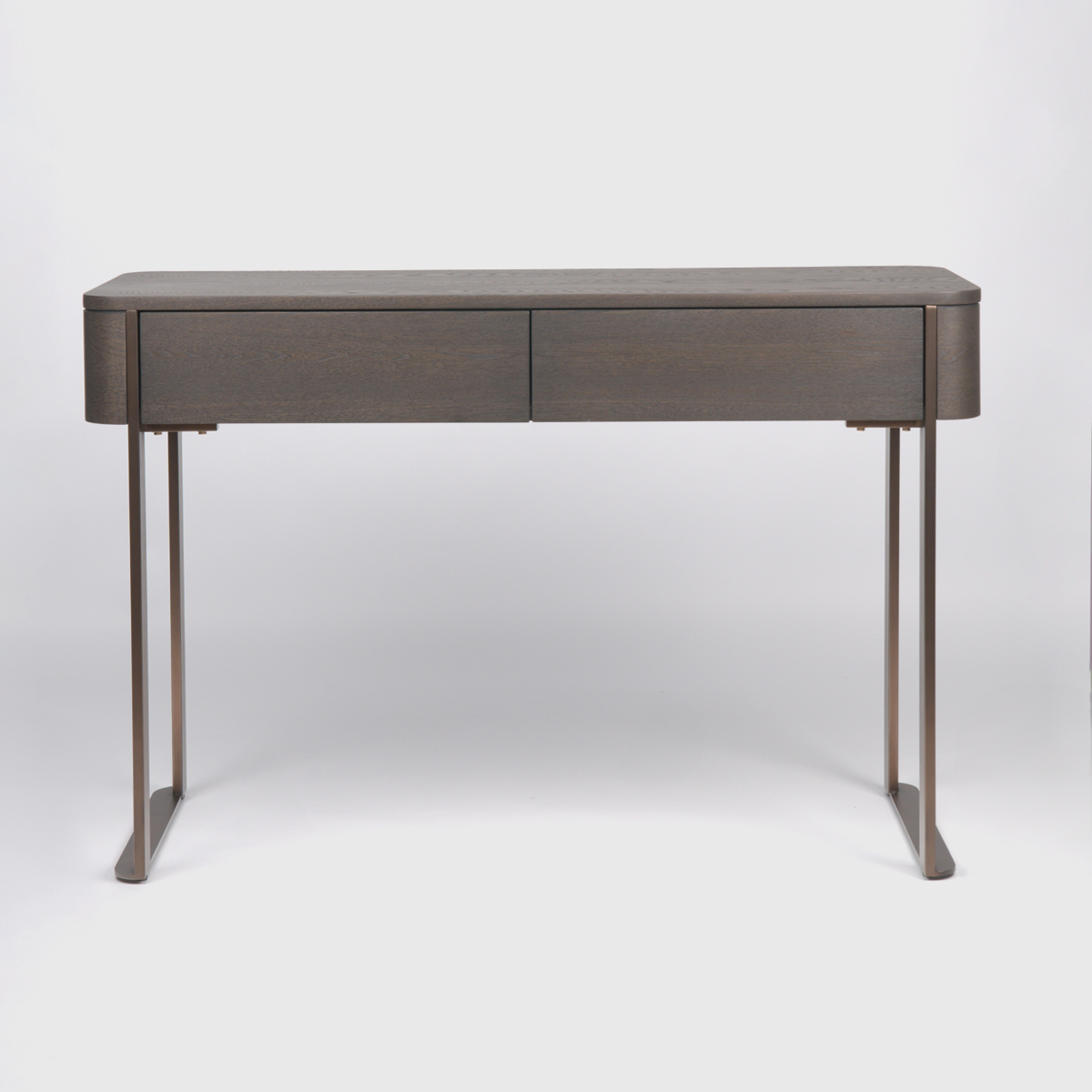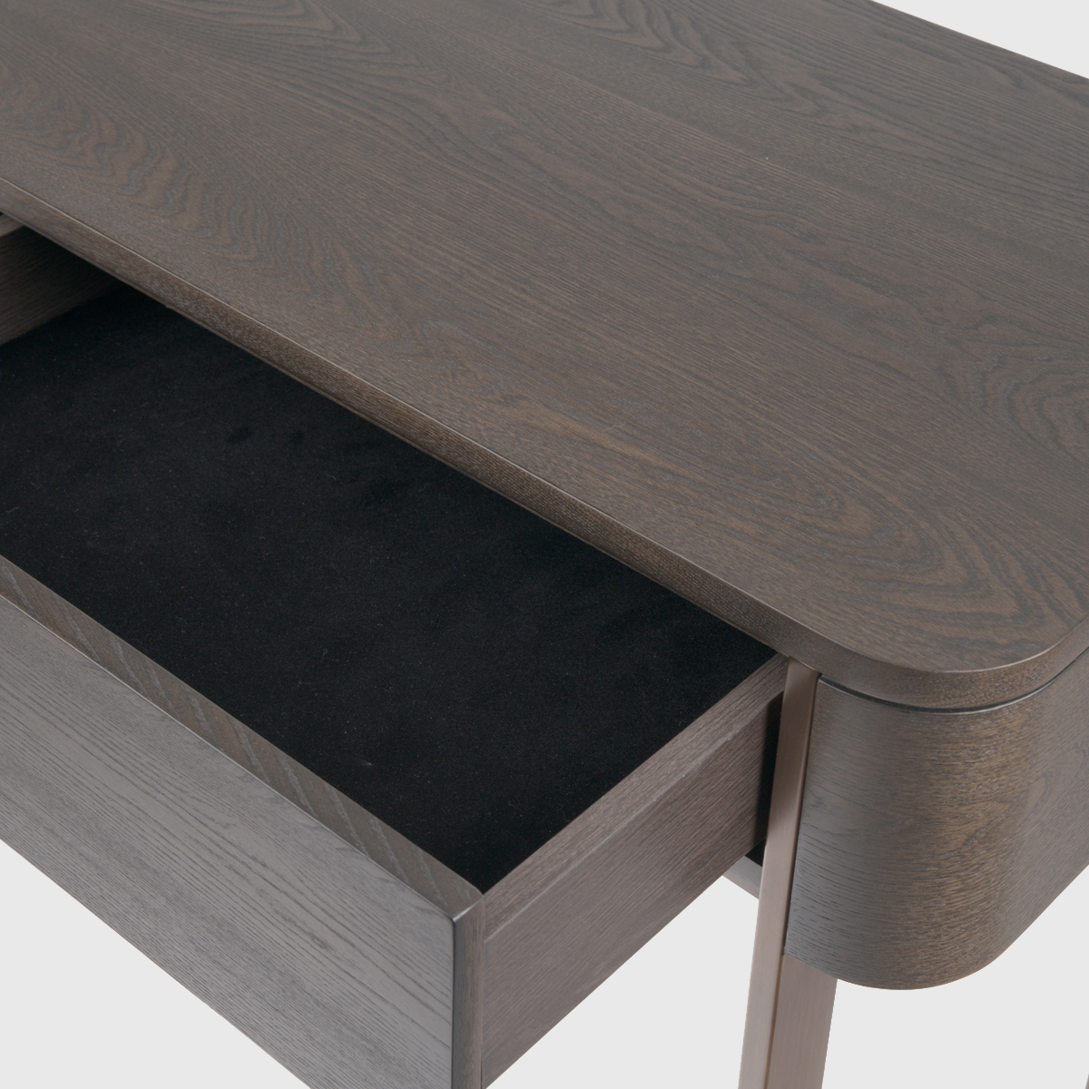 The console’s two drawers are fitted with a soft closure mechanism to ensure functionality alongside style. The absence of external handles promotes a streamlined facade, accentuated by gentle rounded corners and enhanced with bespoke bronze-finished stainless steel, adding a subtle metallic flair to its base.