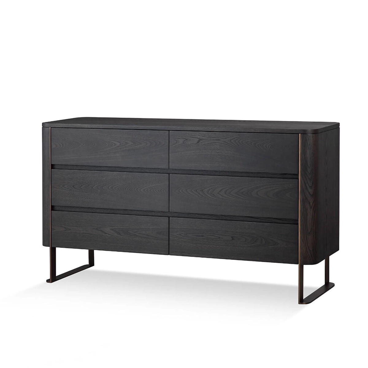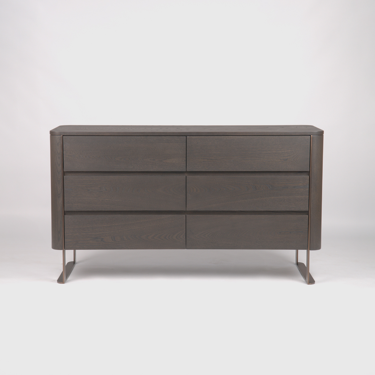 This chest boasts meticulous craftsmanship, from its fully lined, soft-closing drawers to the absence of external handles, creating a sleek facade. Gentle rounded corners soften its silhouette, while bespoke bronze-finished stainless steel details add a subtle contrast, culminating in elegantly splayed feet that underscore its chic, modern look.