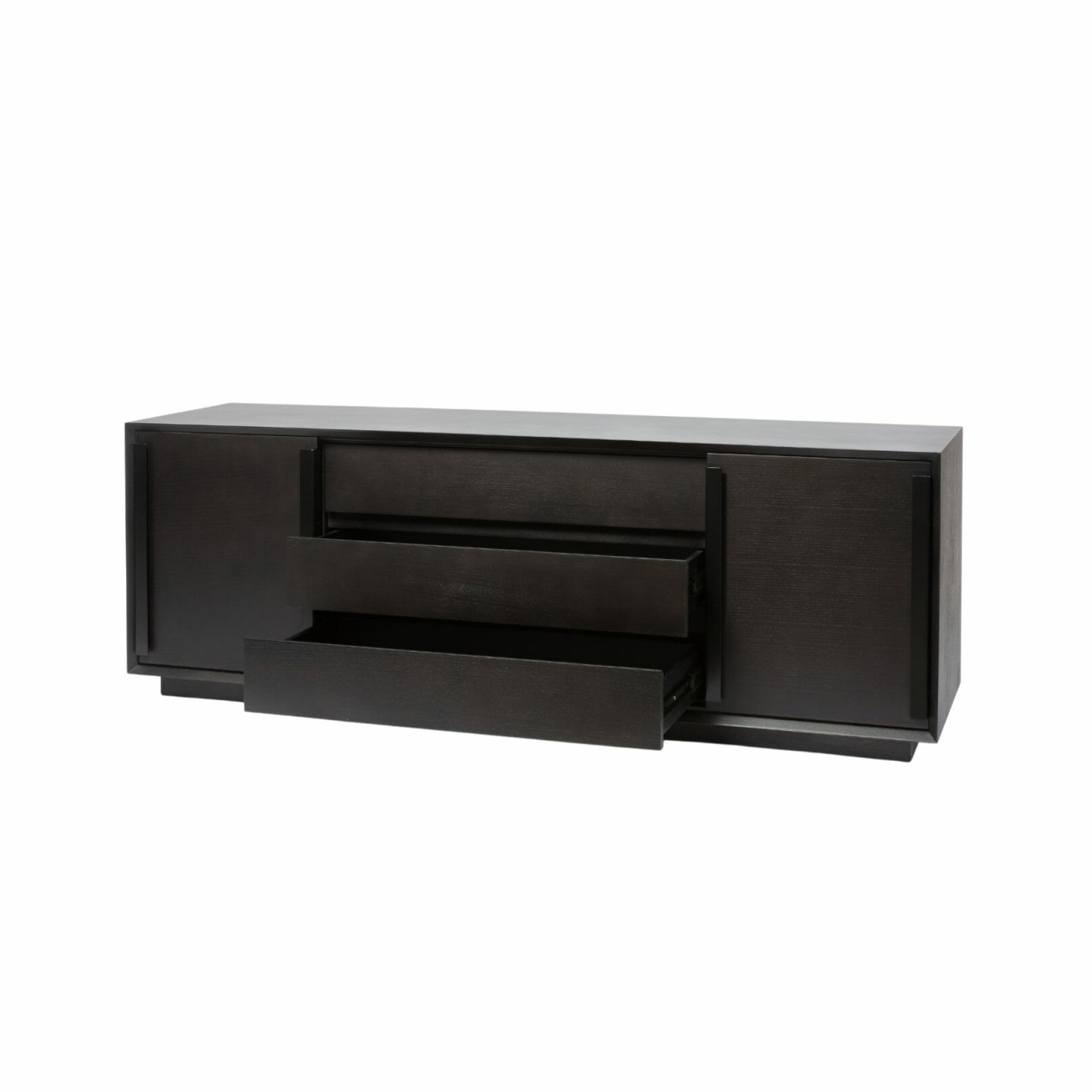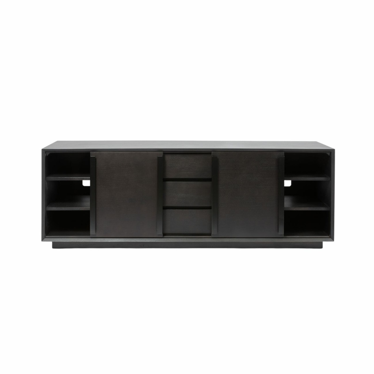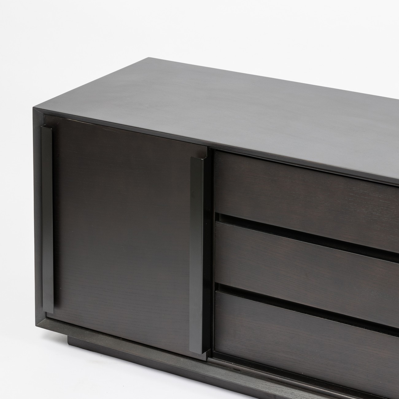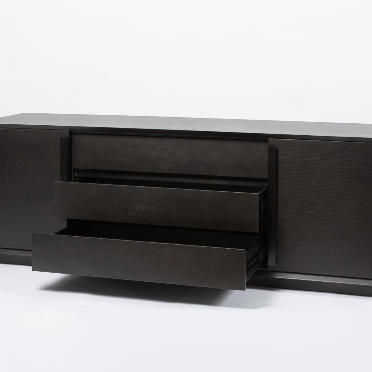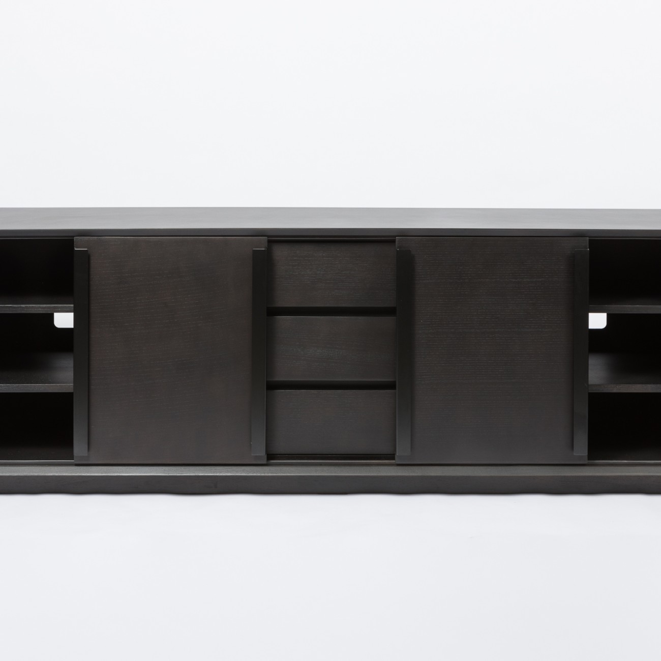 The Matte Media cabinet has been designed to be an easy addition to either a new or existing design scheme. An essential aspect of the Media cabinet is the pairing of the clever arrangement of door and drawers, the matte carbon metal handles, and our unique carbon wood colour. The Matte Media cabinet features two ‘push me pull me’ sliding doors. When closed the cabinet display 3 drawers with integral pulls. When open the cabinet reveals 2 shelfs for media equipment. There are predrilled cable access points to the back.