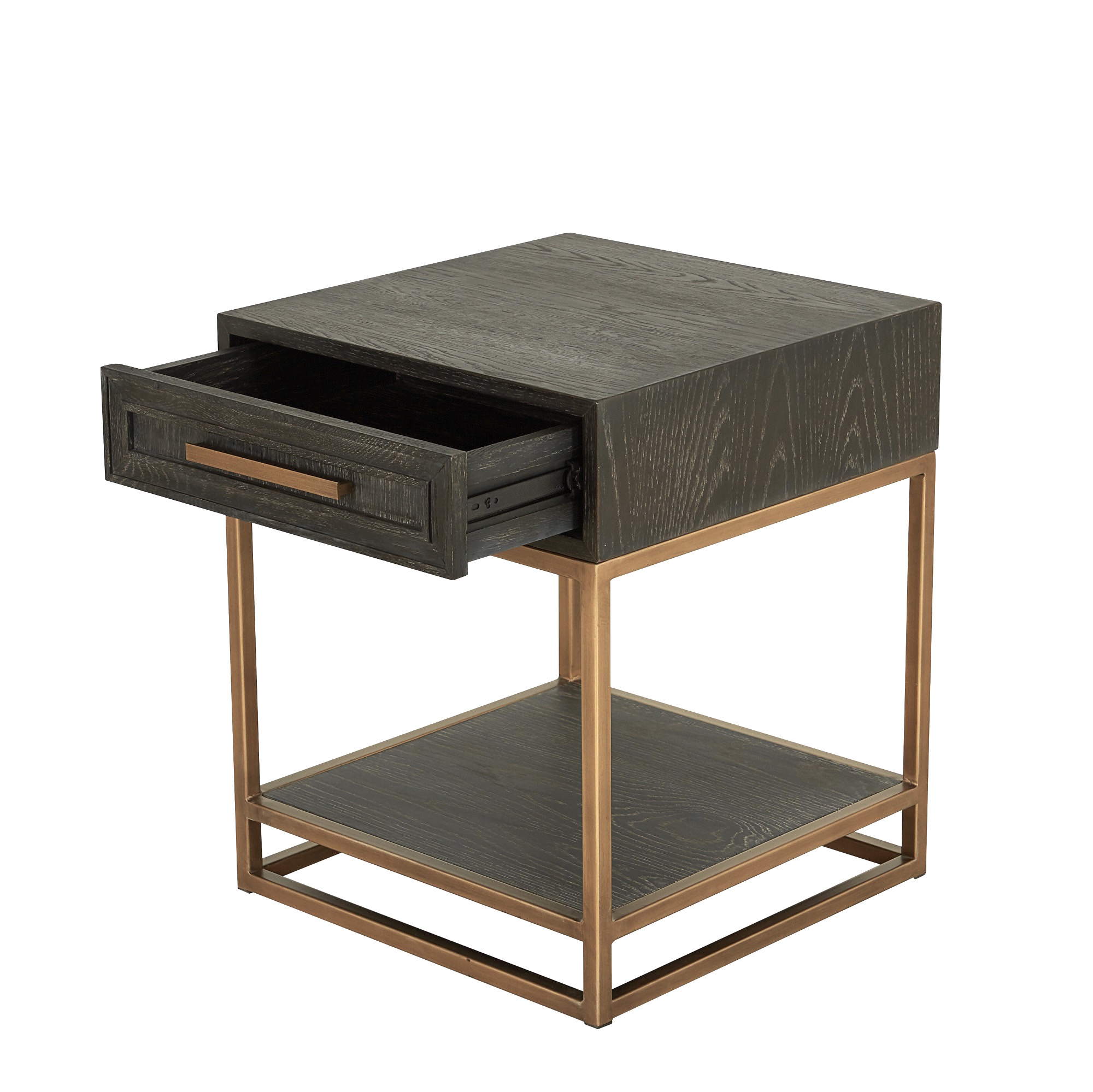 The Renmin side table carbon oak is an elegant bedside table to use within a design scheme. The textured oak wood is finished in our exclusive carbon colour, which is a warm and dramatic neutral. The metal gilt details and handles are designed to complement the oak and provide a discreet detail.