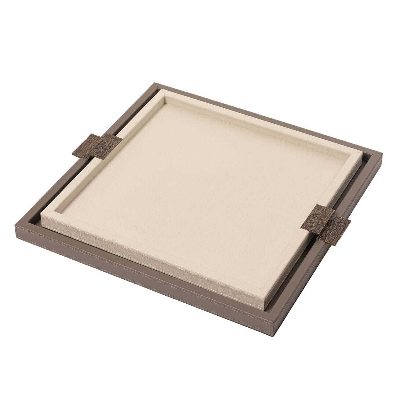The Wode Tray Square Putty Leather is covered in luxurious leather and features elegant hand cast bronze handles. The Wode Trays are available in a selection of sizes and leather choices.